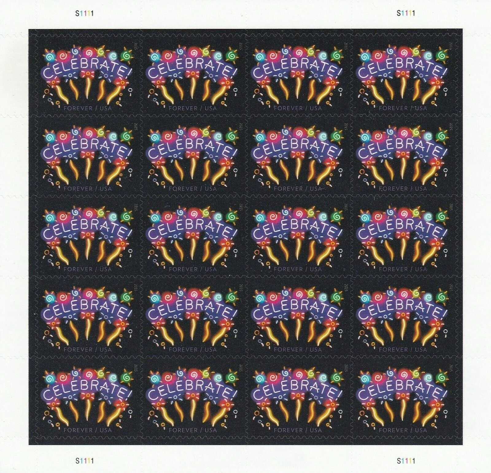 The U.S. Postal Service issued the “Celebrate!” stamp in 2015 to commemorate joyous occasions, drawing inspiration from the vibrant imagery at the Museum of Neon Art in Los Angeles.
